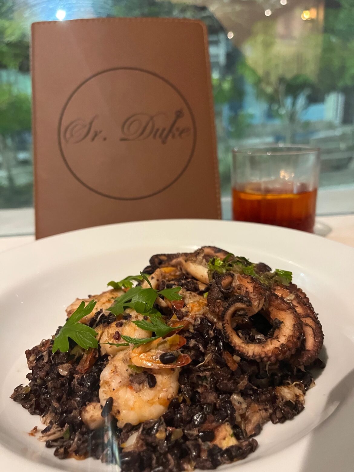 O prato principal leva o nome do estabelecimento. O Arroz Sr. Duke é feito com arroz negro, caldo de camarão, camarão soterrado, polvo grelhado e filé de siri.